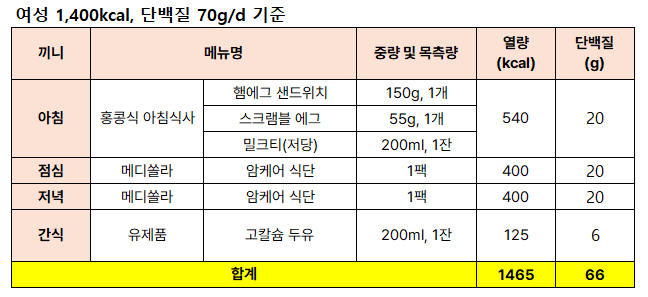 암환자를 위한 하루 식사 구성은 메디쏠라 [암케어] 식단 2팩을 활용하여 다음과 같이 제안드려요.